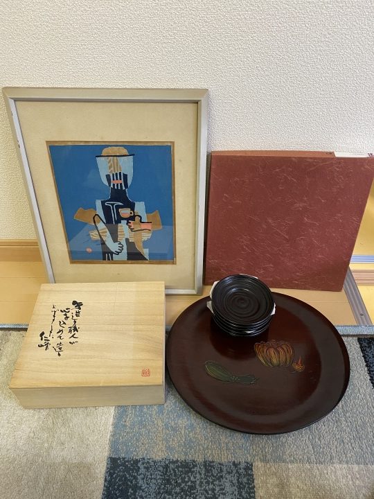 畦地梅太郎の版画に象谷塗の盆に銘々皿、木箱入の陶器。