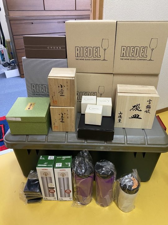 早速拝見すると、たくさんのワイングラスにブランド品の紙袋、携帯用マグに小壺、コーヒーカップ等のお品が…