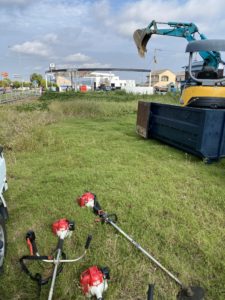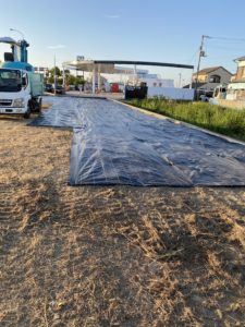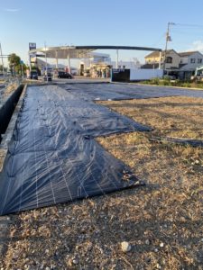「応援で入ってや!」との事で引くに引けずお手伝い。先ずは草を刈って刈り終えた後に動噴を使って除草剤を撒き、それから防草シートと…