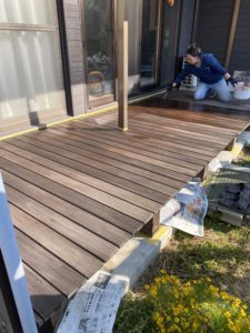 先ずはウッドデッキから、汚れを落とし塗料をヤスリで軽く落としてから塗装。