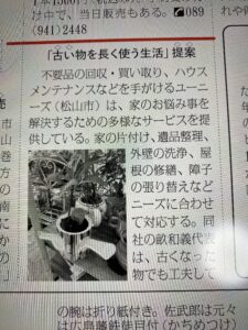 愛媛新聞さんのご好意でU-NEEDS(ユーニーズ)の記事を書いて頂きましたが、ブログですっかりご紹介するのを忘れており、特に上記のお友達は少なからず絡みもあるのに違う話に花が咲き、記事すら見せる事なく帰宅…