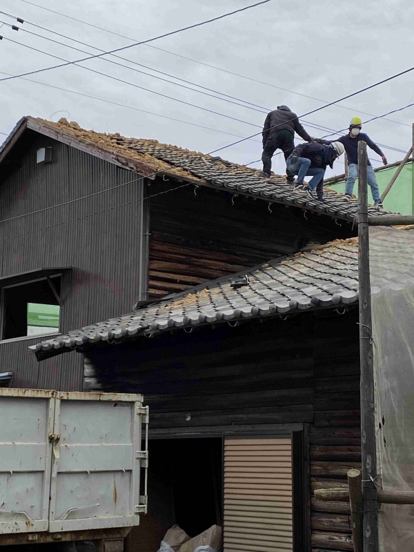 4人で屋根に上がり、バケツリレー方式で瓦をどんどん剥がしていきます。